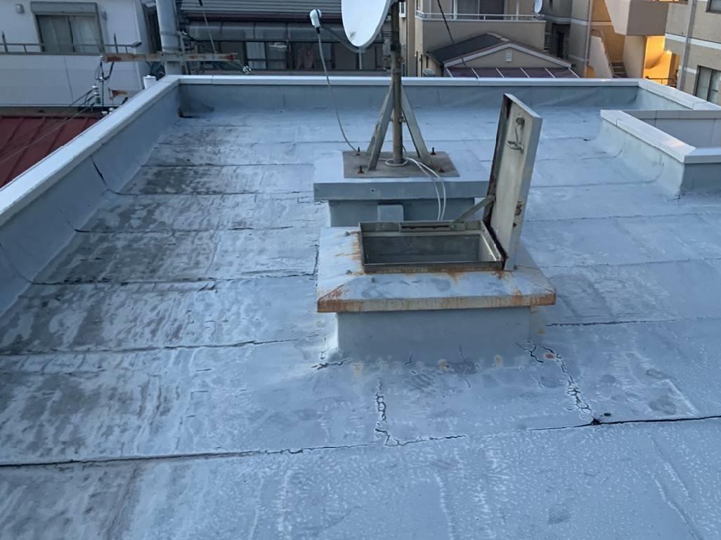 屋上を見させて頂いた所、既存の塩ビシートが経年劣化しており、亀裂も多数ありました。